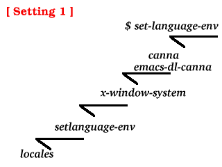 (このように日本語ではでません。だってまだ日本人ではないですから) 1-設定するlanguageの選択 <---- ----------------------------------"7"のja(Japanese)を選択 2-漢字サーバの確認 <----------- ---------------------------------WnnとSKKは"N"を選択 3-日本語には関係の無い様々な設定を行いますか <------------------"Y" 4-X Window Systemで動くプログラムの設定です。(.Xresources) <-----"Y" 5-.bash_profileの設定、(.bashrcを読みに行く設定をします) <-------"Y" 6-.bashrcの設定(かなりいろいろ設定します) <----------------------"Y" 7-CANNAの設定をします。(.canna) <-------------------------------"Y" 8-csh(.cshrc)の設定 <--------------------------------------------"N" 9-emacsの設定(.emacs) <------------------------------------------"Y" 10-emacsのかな漢字変換サーバの選択 <------ -----------------------"1"のcannaを選択 11-bashなどReadLineライブラリを用いたプログラムの設定(.inputrc)<-"Y" 12-nviの設定(.nexrc) <-------------------------------------------"N" 13-nvi-m17nの設定(.nexrc-m17n) <---------------------------------"N" 14-nvi-m17n-cannaの設定(.nexrc-m17n-canna) <---------------------"Y" 15-XDMログイン時の設定(.xssesion) <------------------------------"Y" 16-xemacs21の設定 <----------------------------------------------"n"設定が終ると自動的に不足しているパッケージを指示してくれる。