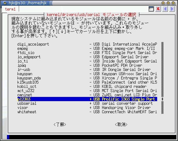 Mar 3 05:08:15 localhost kernel: usb 1-1: PL-2303 converter now attached to ttyUSB1 Mar 3 05:08:16 localhost usb.agent[4728]: pl2303: already loaded Mar 3 05:09:00 localhost kernel: usb 1-1: USB disconnect, address 9 Mar 3 05:09:00 localhost kernel: PL-2303 ttyUSB1: PL-2303 converter now disconnected from ttyUSB1 Mar 3 05:09:00 localhost kernel: pl2303 1-1:1.0: device disconnected Mar 3 05:09:04 localhost kernel: usb 1-1: new full speed USB device using address 10 Mar 3 05:09:04 localhost kernel: pl2303 1-1:1.0: PL-2303 converter detected Mar 3 05:09:04 localhost kernel: usb 1-1: PL-2303 converter now attached to ttyUSB1 Mar 3 05:09:05 localhost usb.agent[4804]: pl2303: already loadedどうやら palm m500 のときと同じく"ttyUSB01"にアタッチされた模様。